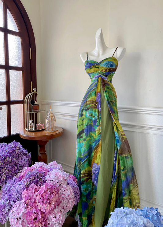 Yellow-green halter-neck high-waisted elegant long ball gown R6950
