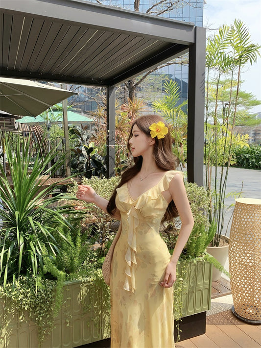 Yellow v-neck floral dress with ruffles, beautiful and unique waist-hugging hip skirt R0500