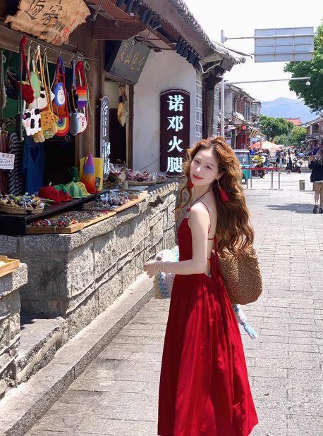 Yunnan Dali wear French red suspender dress with backless seaside vacation photo skirt R0217