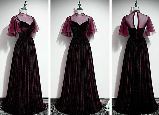 Velvet A-Line Long High Neckline Party Dress, Wine Red Long Bridesmaid Dress S2563