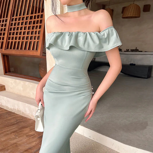 Off-Shoulder Ruffled Midi Mermaid Dress S6739
