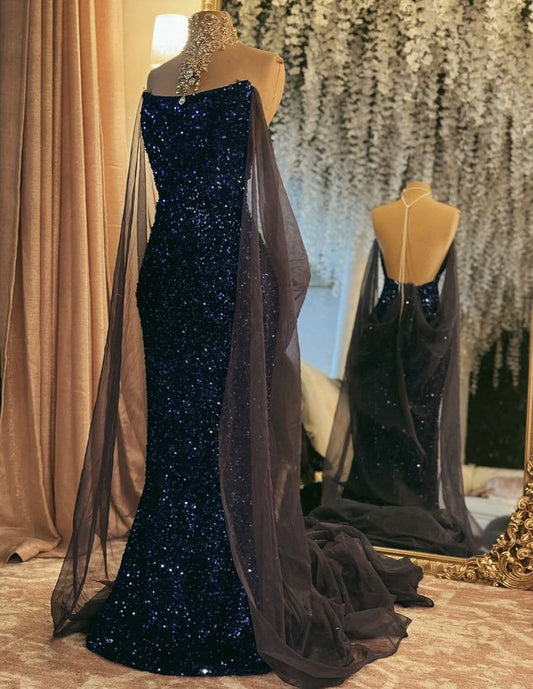 Navy Blue Sequin Mermaid Party Prom Dresses Long Evening Dress S6576