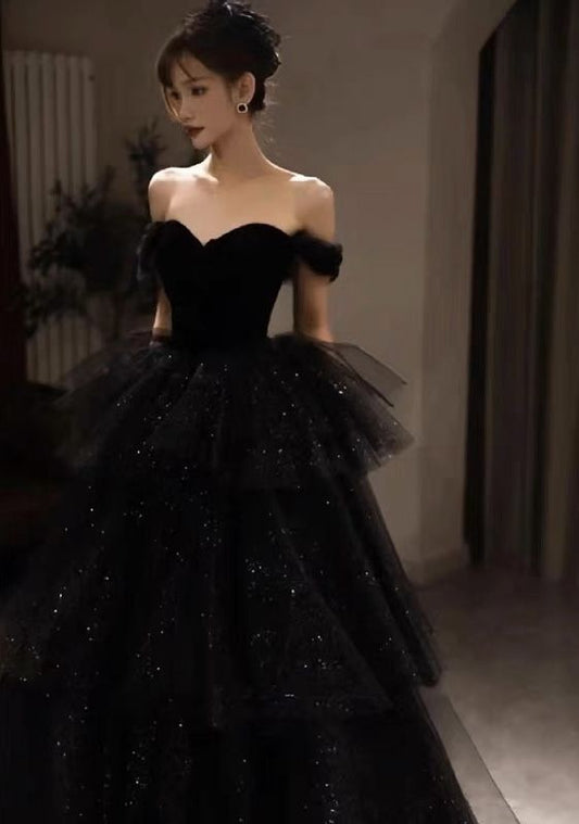 Off-Shoulder Dress, Elegant Black Evening Gown for Prom or Wedding S6416