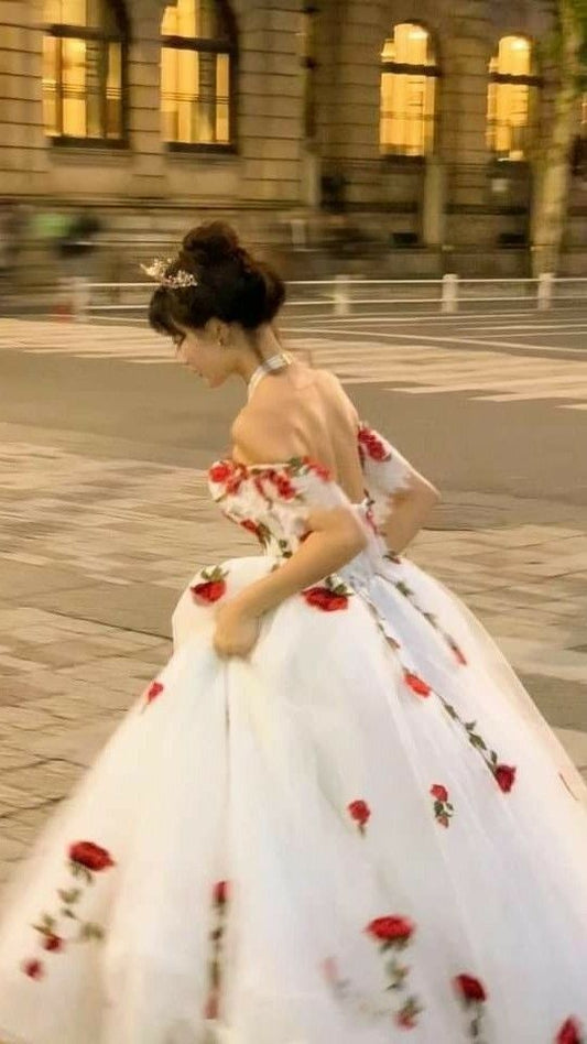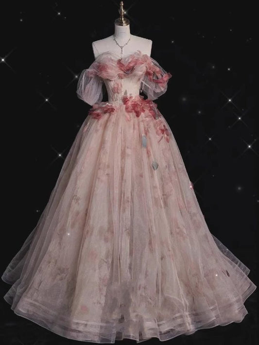 Pink Appliques Prom Dresses Ball Gown Off-The-Shoulder Floor-Length Long Prom Formal Dresses S6383