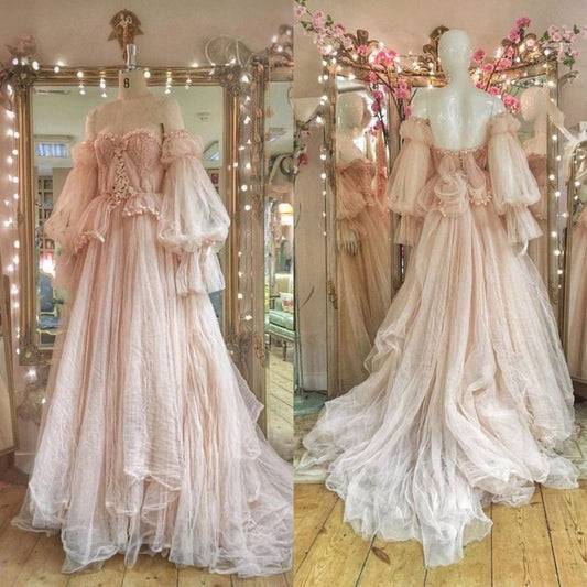 Princess Pink tulle Ruffles Long Prom Dress,Wedding Gown with Bubble Sleeves S6354