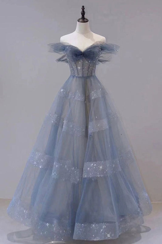 A-Line Off Shoulder Layers Tulle Long Evening Dress, Blue Formal Dress S6342
