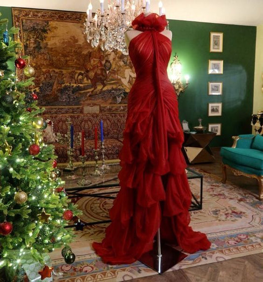 Modest High Low High Neckline Tulle Red Prom Dresses S6267