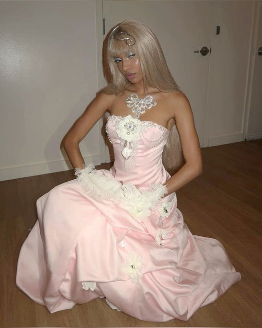 Vintage Pink Strapless Satin Long Prom Dresses Evening Dress With Flowers S6266
