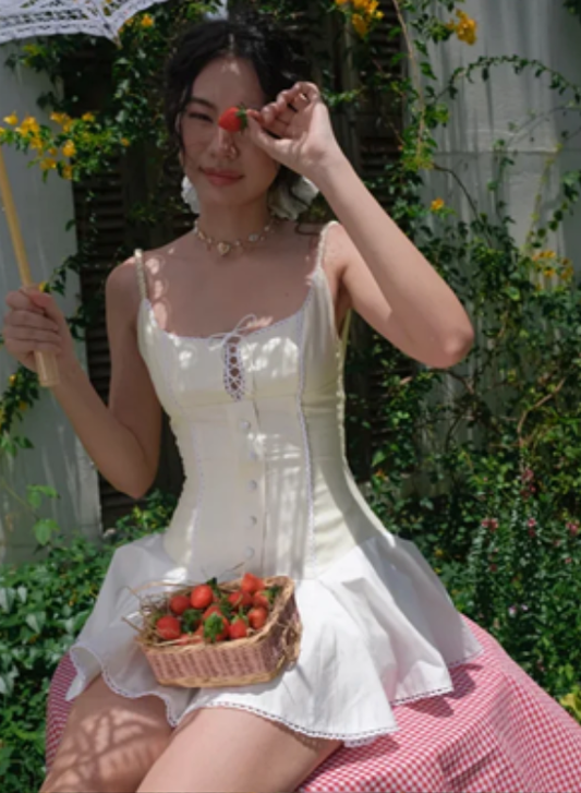 White suspenders slim waist cute playful A-line mini skirt homecoming dress R4644