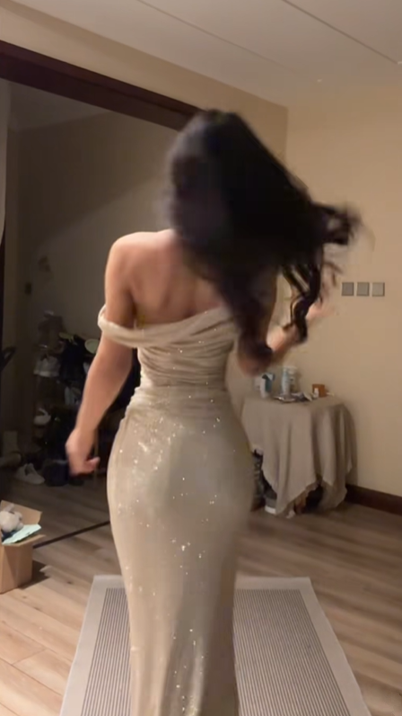 Champagne Strapless Crystal-Embellished Waist-Cinched Sexy Bodycon Floor-Length Prom Dress R7111