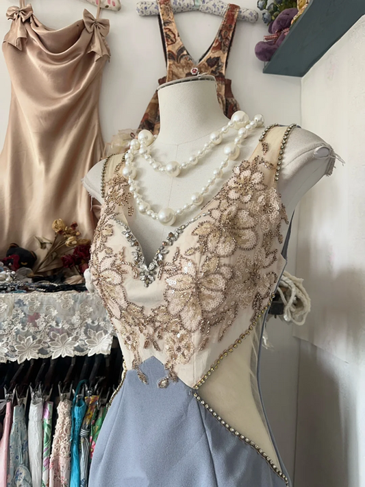 Retro stitching beaded waist slim hip short skirt ball gown R6196