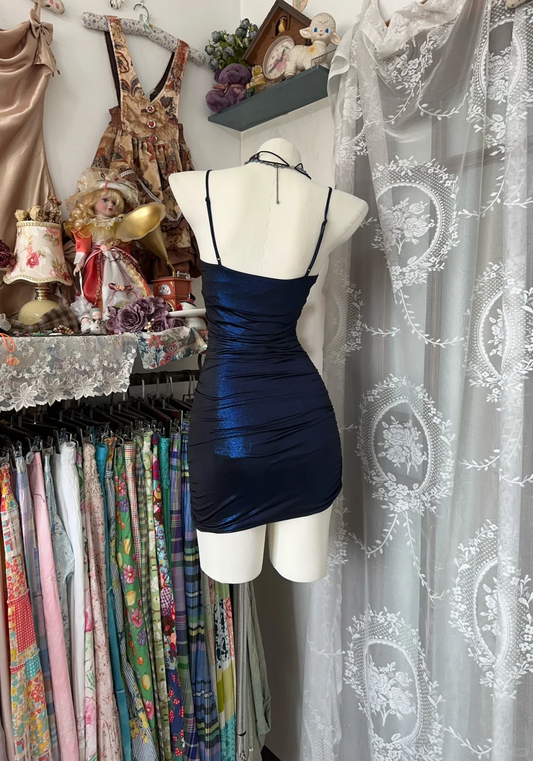 Dark blue suspender satin waist slim hip short skirt ball gown R6177