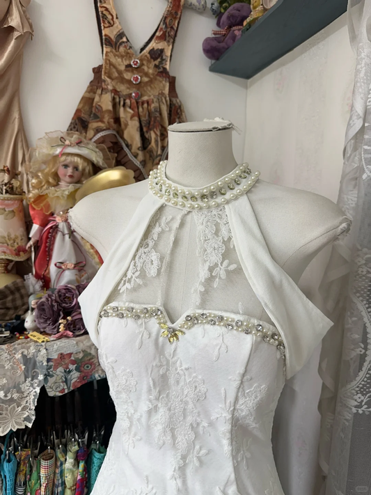 White halterneck sleeveless waist slim fit A-line lace skirt short ball gown R6171