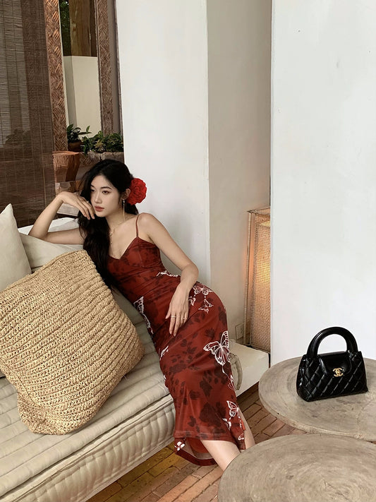 Retro red butterfly print V-neck dress for women summer long party dress S5730