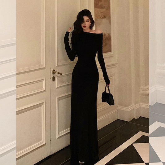 Black off-shoulder long-sleeved dress for women,long party dress S5709