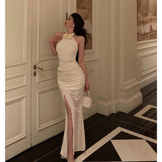 Flower lace halter neck top + pleated hip-wrapped slit skirt two-piece suit for women party dress S5701