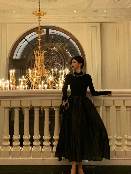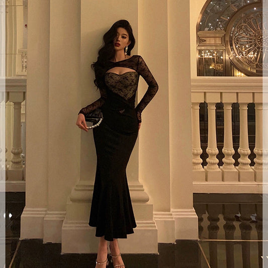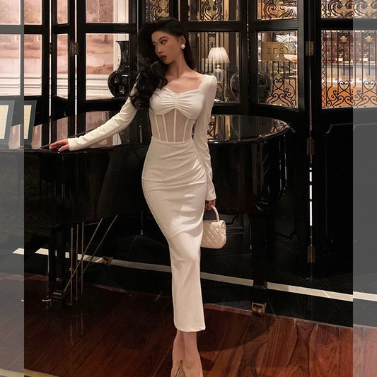Gray long-sleeved dress for women new pleated long party dress S5689