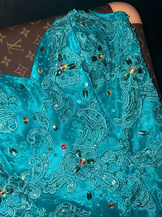 Lake blue strapless, fitted waist, hip-hugging, long fairy ball gown R6929
