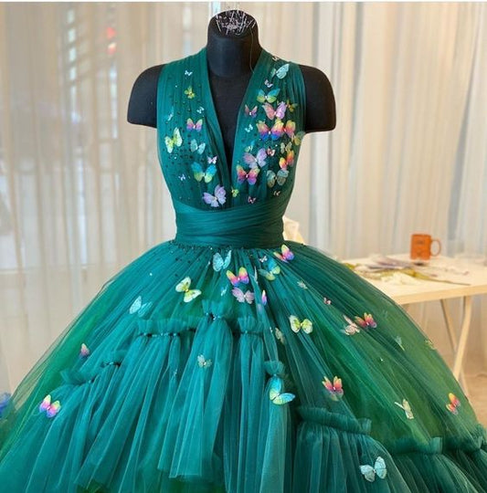 Green Tulle Ball Gown Layered Evening Dress Floor Length High Low Dress With Butterfly Cross Prom Dress Floor Length Dress S1648