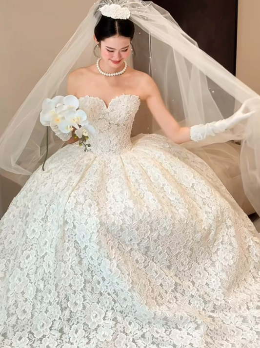 White strapless lace waist slim elegant puffy skirt long dress bridal dress R6030