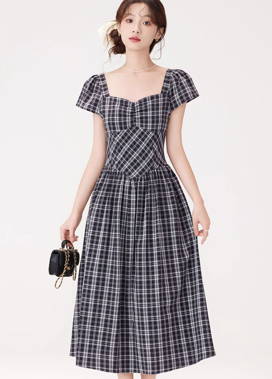 French retro square collar plaid dress new style waist slim long skirt temperament high-end R2372