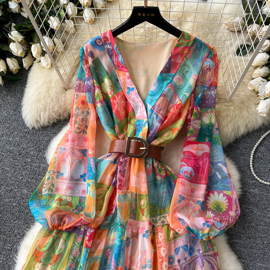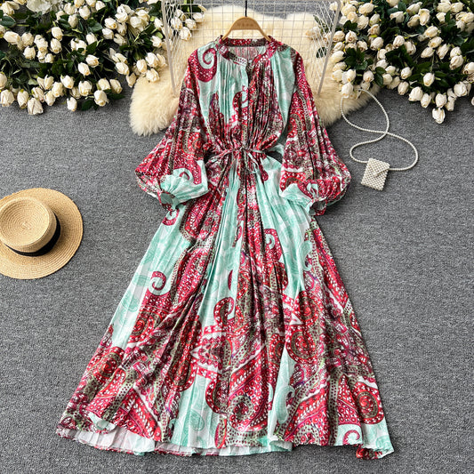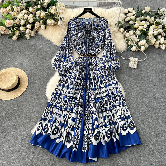 European and American style pleated printed dress lantern long sleeve waist slim long skirt R2322