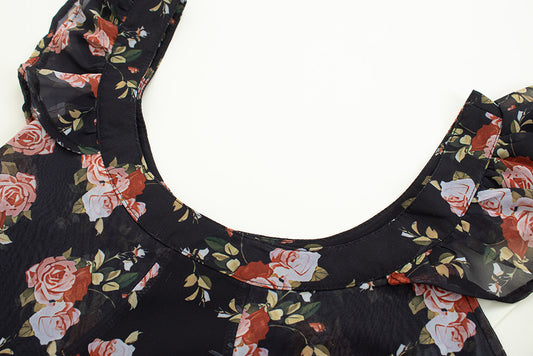Black small flying sleeve slim floral long skirt 2025 new holiday style French retro dress R0048