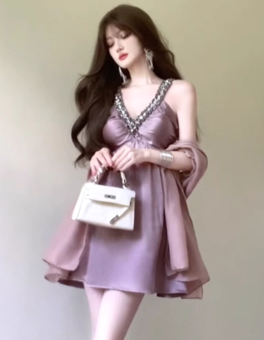 Large French heavy diamond V-neck dress, elegant lady short skirt R1836