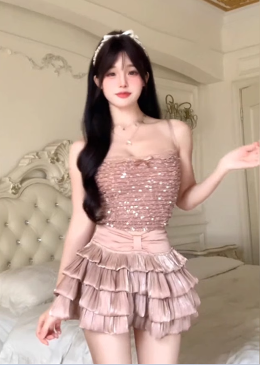 Large size French niche rich girl style sequined slim fit camisole top and puffy skirt suit R1838