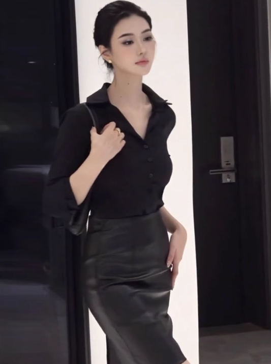 Large size French pure sexy black shirt intellectual style sister hip skirt suit R1837
