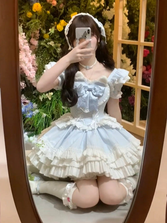 Blue and yellow cute sweet lolita fashionable short-sleeved OP dress fluffy runaway princess dress Lolita R1682