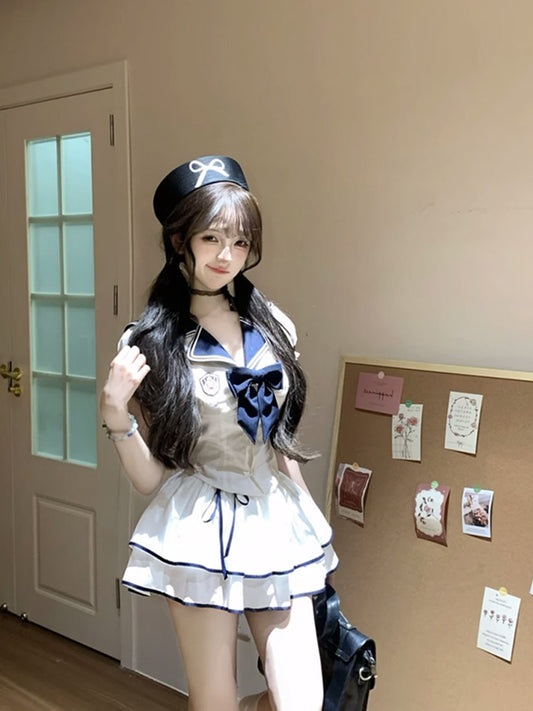 Lolita girl college style pure desire hot girl suit navy collar top skirt bow short two-piece suit R1679