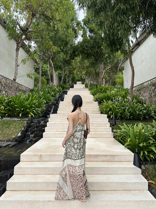 Travel wear seaside vacation retro print halter dress bohemian loose beach dress R1609