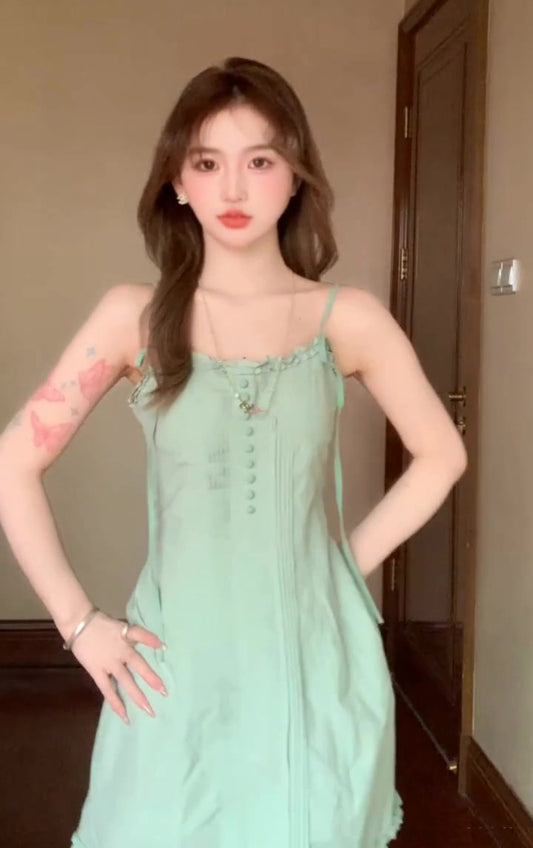 Green suspender dress holiday waist a-line short skirt beautiful skirt R0899