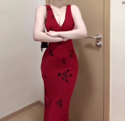 Retro V-neck red suspender dress sexy waist temperament hip fishtail long skirt R0712