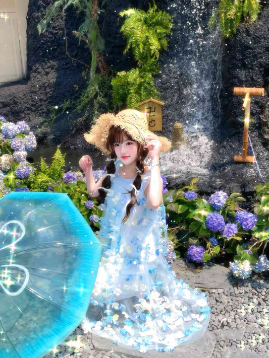 Gentle and sweet style blue flower short-sleeved dress holiday style A-line long skirt R0721