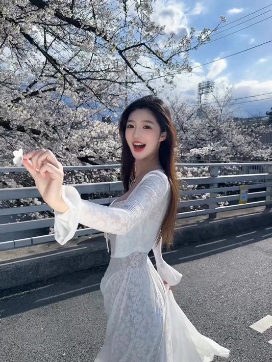 Elegant and decent skirt, gentle style, beautiful waist A-line white dress R0717