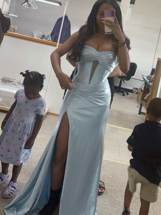 Light blue tube top waist fishbone sexy hip-wrapped maxi dress, prom dress R5382