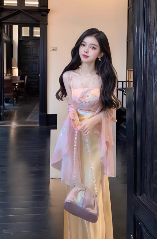 A rich girl's outfit with floral suspender dress, gentle temperament, waisted A-line long skirt R0489