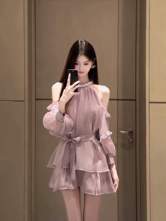 Gentle temperament ruffled sleeveless halter dress unique waist A-line short skirt R0493