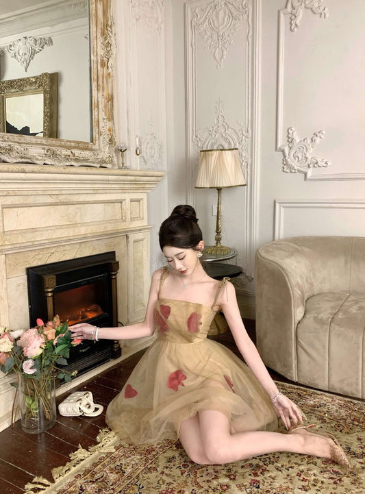 Gentle temperament mesh floral sling dress unique waist fluffy flower bud skirt R0494