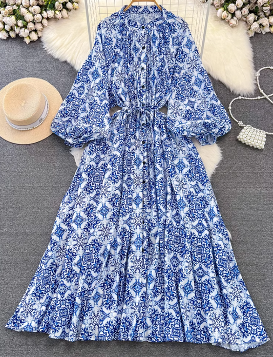 Fashion lantern long sleeve round neck waist a-line print irregular dress elegant long skirt R0404