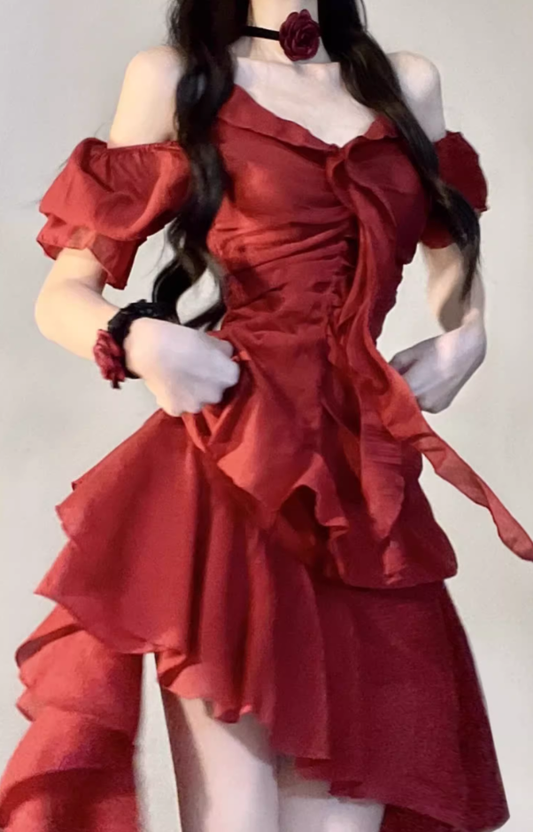 Beautiful dress French style high-end niche design off-shoulder irregular waist small red dress R0415