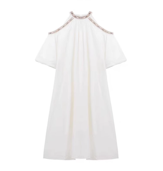 Retro French off-the-shoulder dress, seaside holiday style, cool temperament, unique and chic dress R0419
