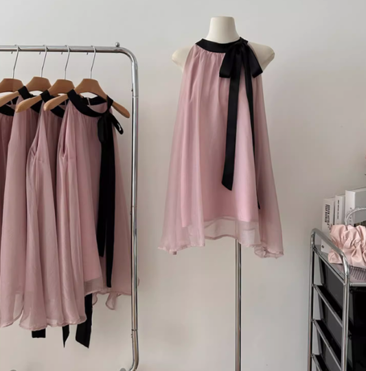 Classic pink and black halter neck dress gentle temperament skirt long skirt for women R0293