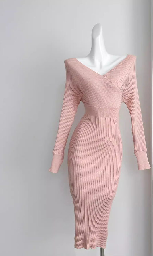 Pure desire slim waist sexy hip pink dress V-neck bottom knitted long skirt R0296