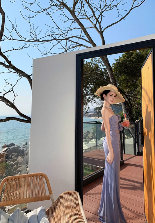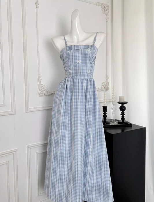 Blue plaid lace slim high-end detachable suspender tube top long dress R0298