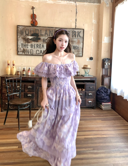Purple long printed waist dress for women summer French retro temperament high-end skirt R4581
