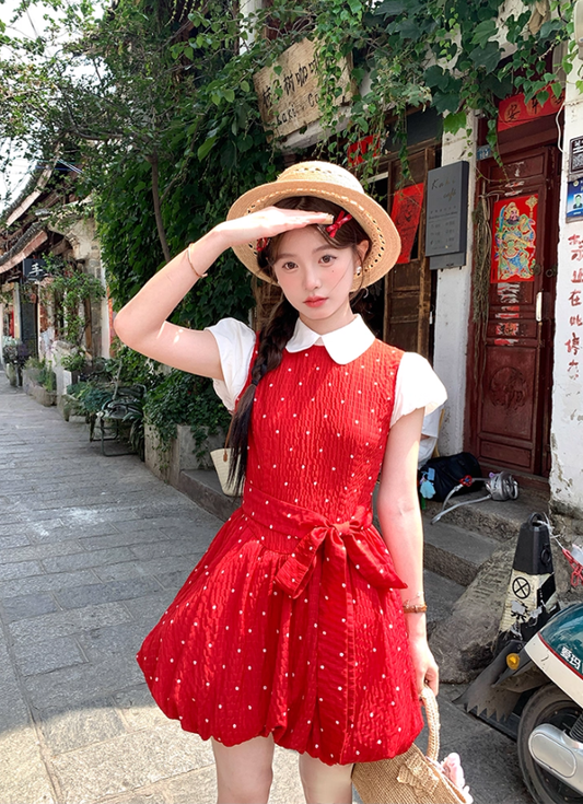 Red doll collar polka dot short-sleeved dress women's summer temperament skirt R4620