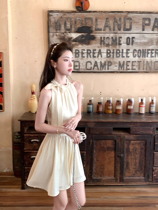 Yellow sleeveless waist a-line dress women's summer French temperament skirt R4622